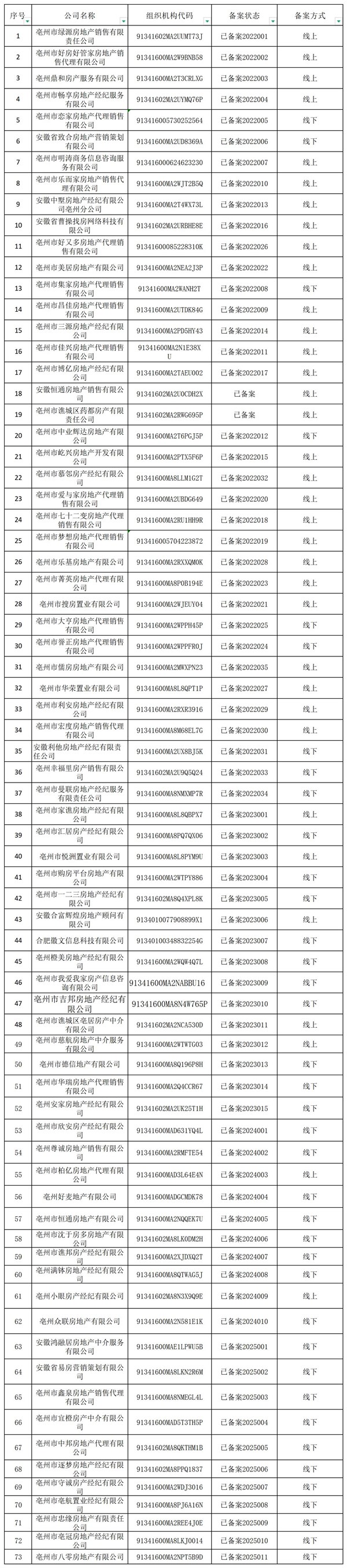 亳州市住房发展中心经纪机构备案公示(2025年9月份)